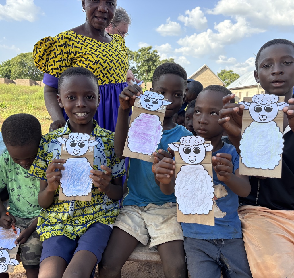 We had a great time at the school talking about the Good Shepherd of Psalm 23. Funny, me the city boy talking to real shepherd children in Ghana. I felt a little sheepish. But they enjoyed our story, and we followed it up by letting them put together sheep puppets.